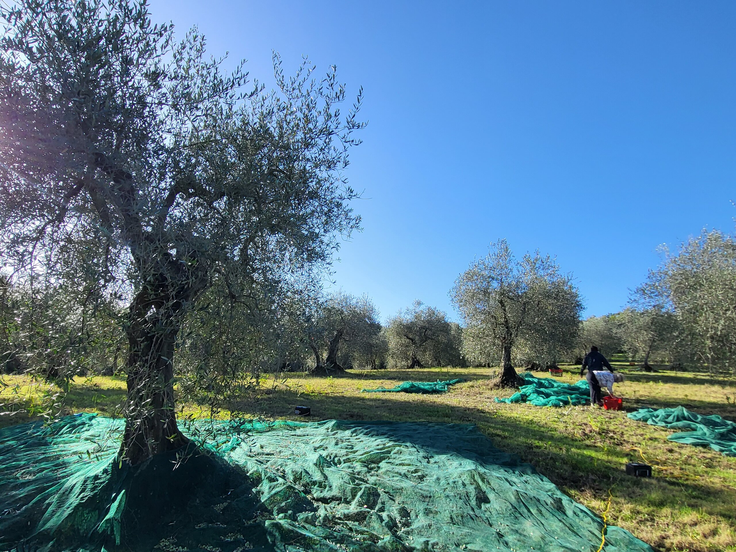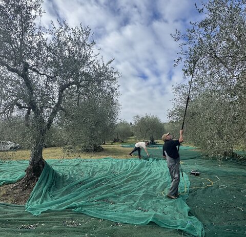 Die Oliven werden traditionell von Hand geerntet - mit Olivenschüttlern und Netzen. Unsere Olivenbäume sind zu 100% unbehandelt und zwischen 70 und 130 Jahre alt.